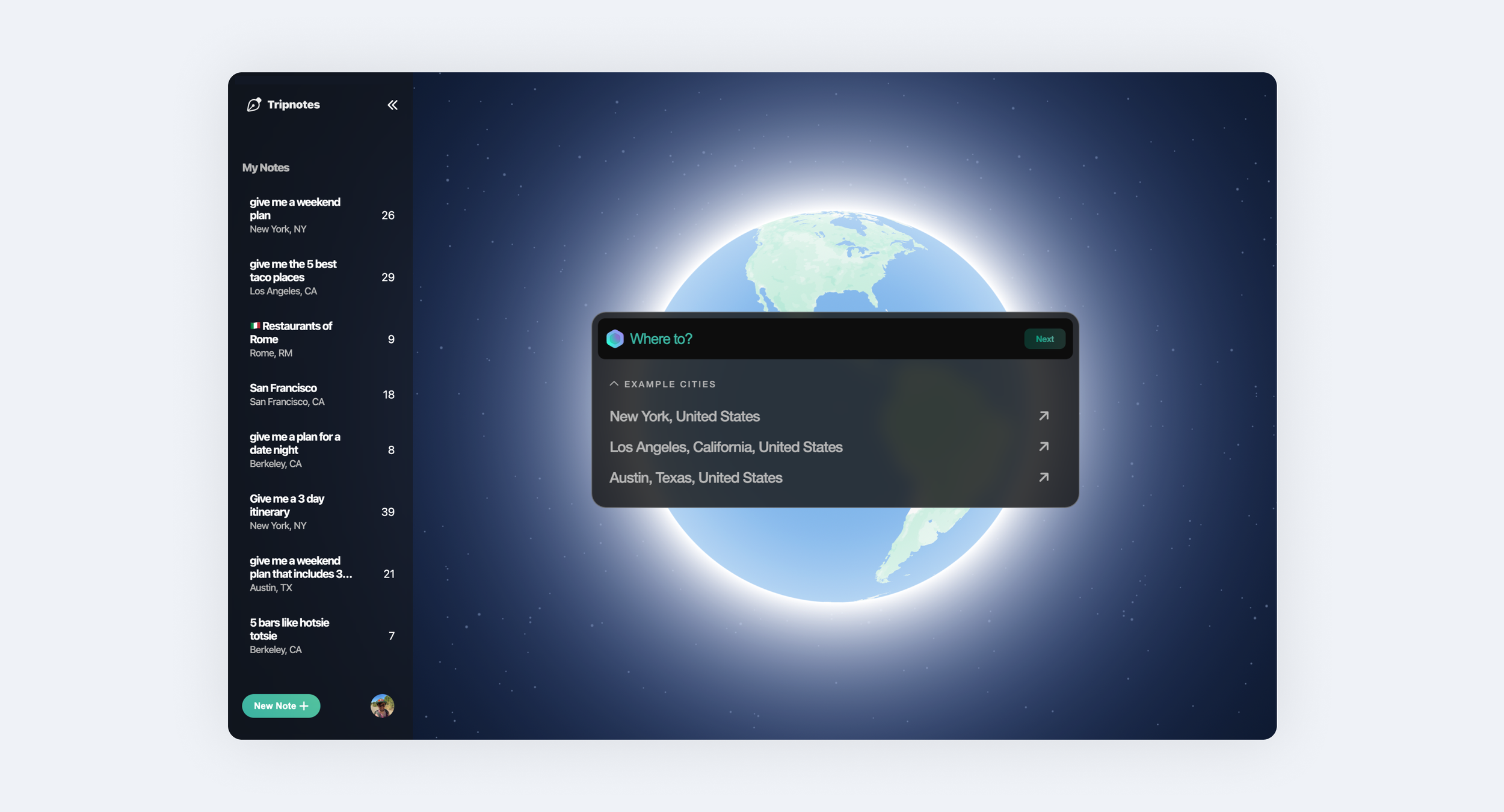 Tripnotes is a travel planning platform for Web and iOS. As Director of Product Design, I lead web, mobile, and marketing efforts through UX & UI design, prototyping, animation and user research. The product is free to demo at tripnotes.ai but currently closed to the public. Learn more and get on the waitlist at the Tripnotes website.